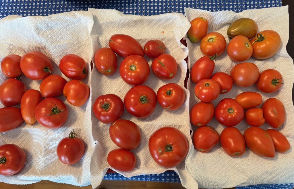 The tomatoes are ripening slowly. We pick them as they look ready. I still have trays of tomatoes on the dining room table, so we’re eating at least one a day!