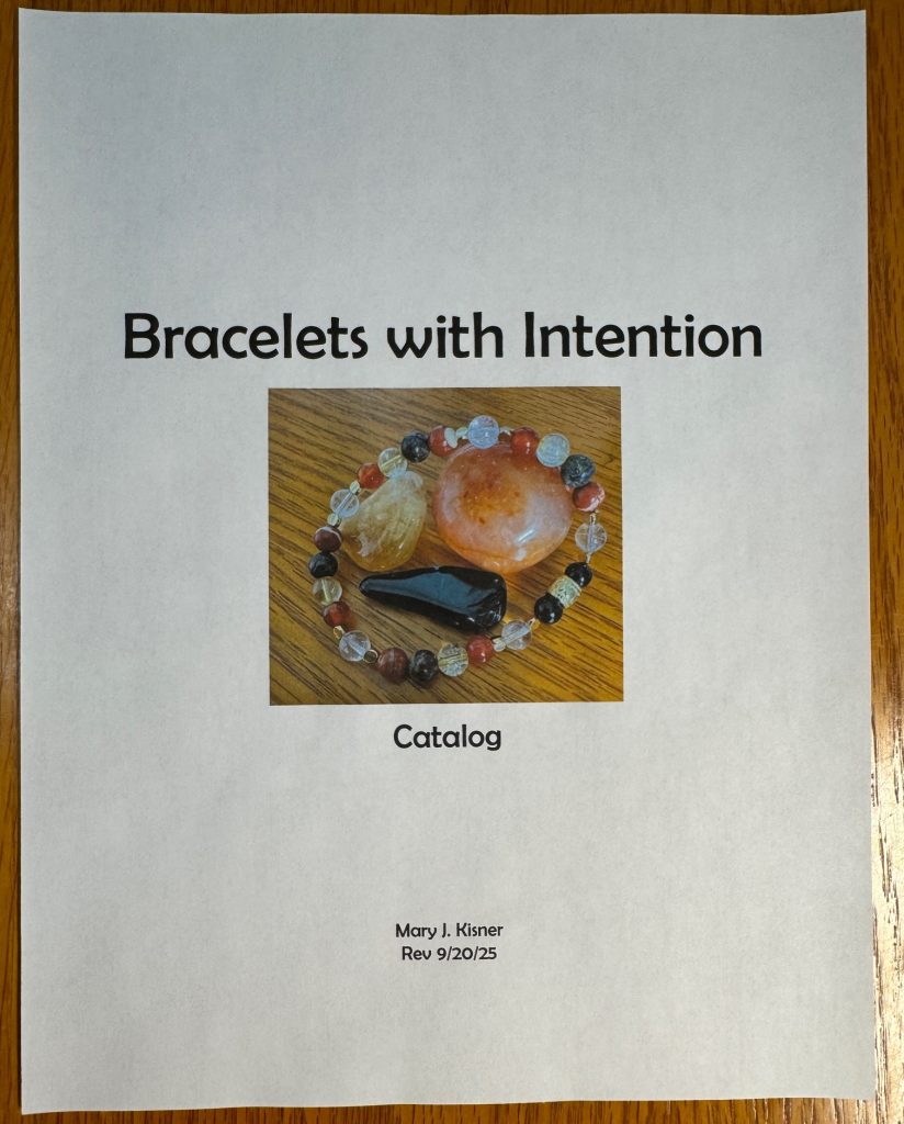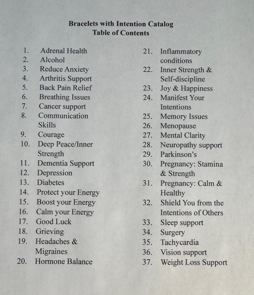 I seem to be getting deeper into making specialty and custom bracelets. I don’t need a huge inventory of bracelets until next summer so I’m focused on researching, designing and making bracelets that might help specific issues. When I make a bracelet for a specific request, I add it to my catalog…in case someone else could benefit. The catalog is a work in progress and not ready for distribution, but I will post the cover and the Table of Contents here. If you look through the list and don’t see a specific issue that you are interested in, please let me know. That might be the exact thing I should add to the catalog!