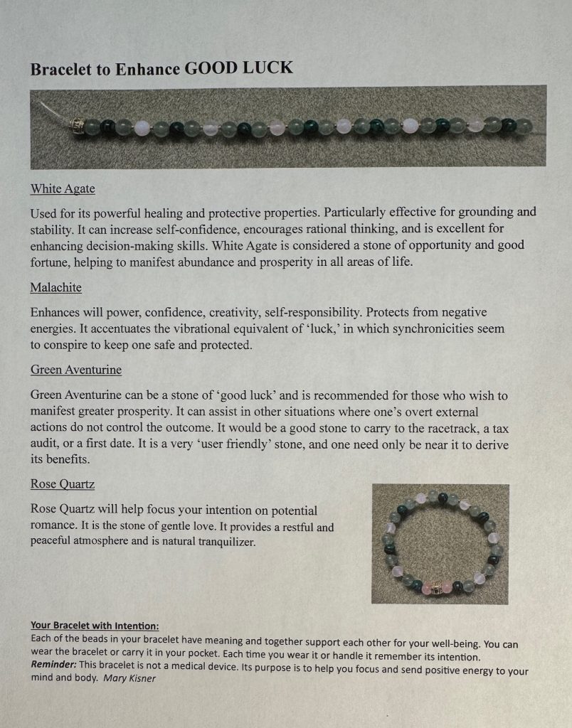 Each of the beads in your bracelet have meaning and together support each other for your well-being. You can wear the bracelet or carry it in your pocket. Each time you wear it or handle it remember its intention. Reminder: This bracelet is not medical device. Its purpose is to help you focus and send positive energy to your mind and body. Mary Kisner