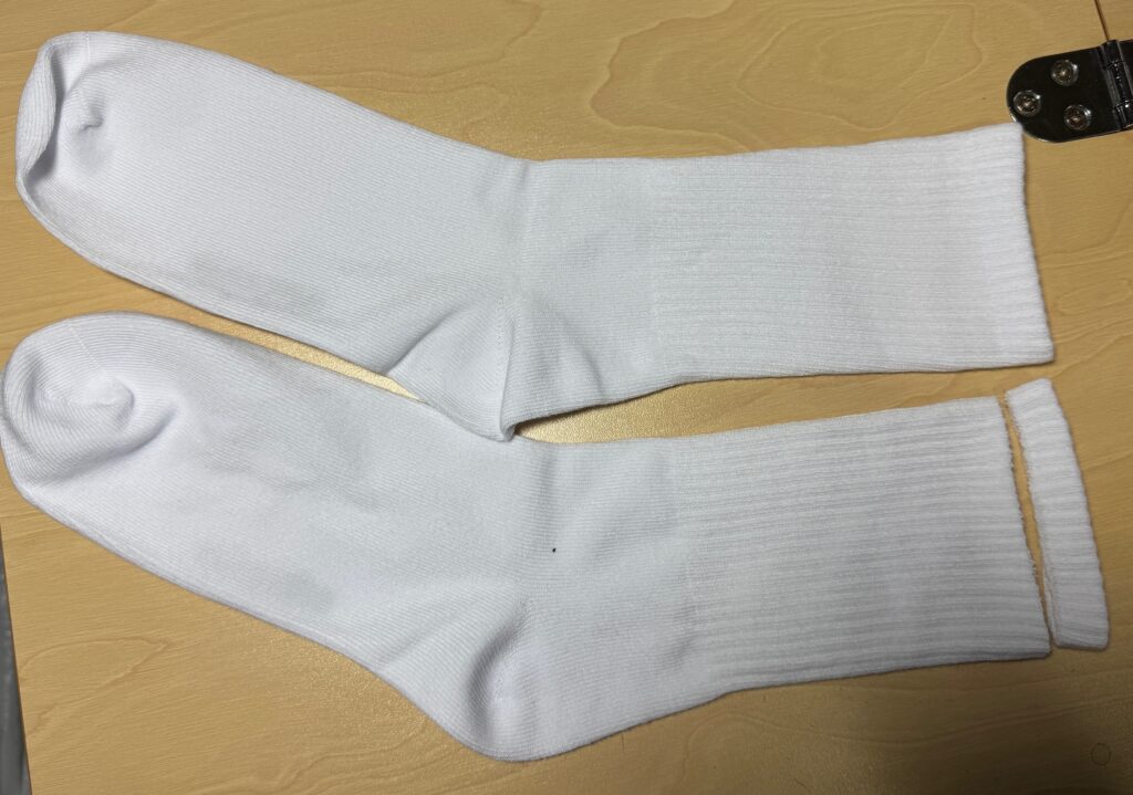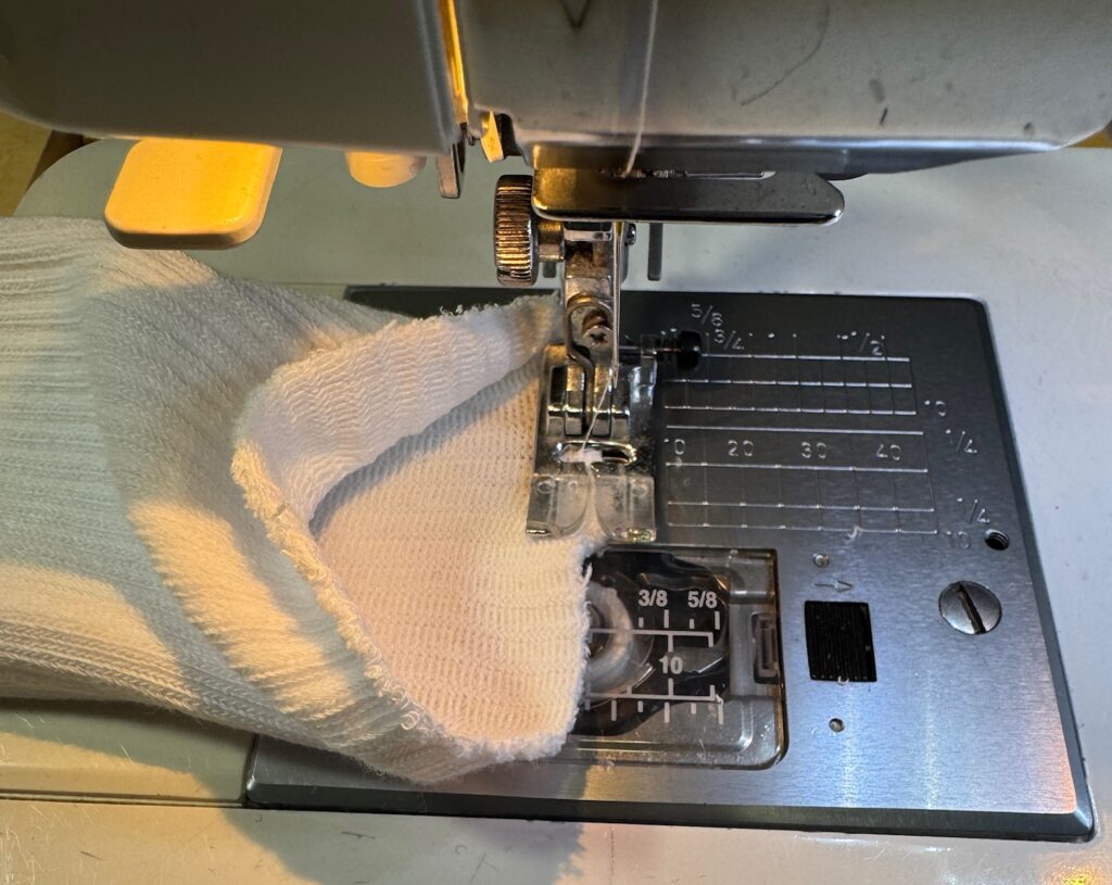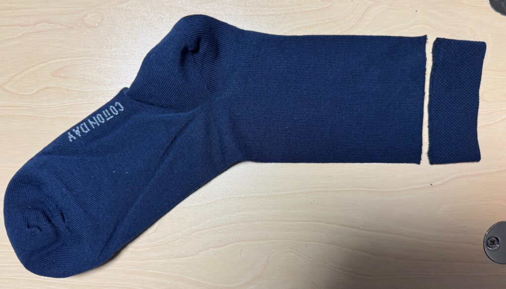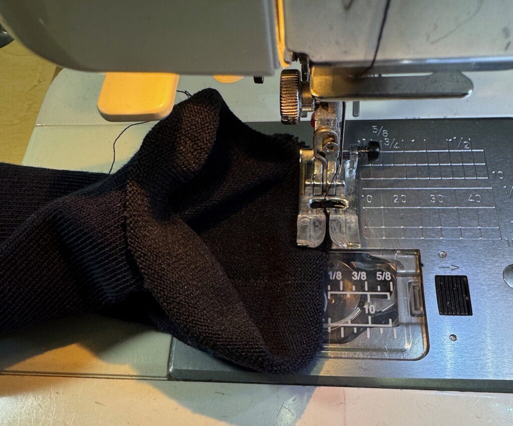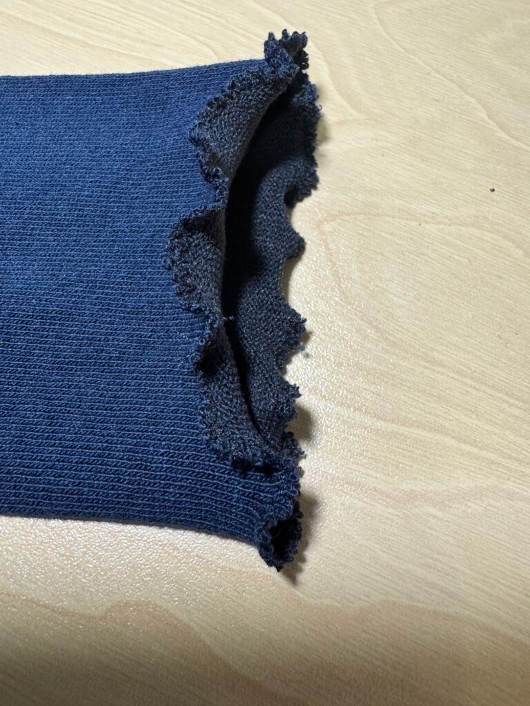 Amazingly, the socks fit well but, of course, the band at the top was too snug for me. So, I did what I usually do to make them more comfortable…I cut off the band and zigzagged the edges. When flat, the top looks ruffled, but when I put them on, they lay flat on my lower calf. The sock has enough stretch to stay up and top doesn’t drive me nuts! I ended up cutting the top band off all 9 pairs of socks and zigzagged the edges. Here are the pictures…pretty simple and worked great! Time to clean out my sock drawer and fix all the ones driving me nuts!