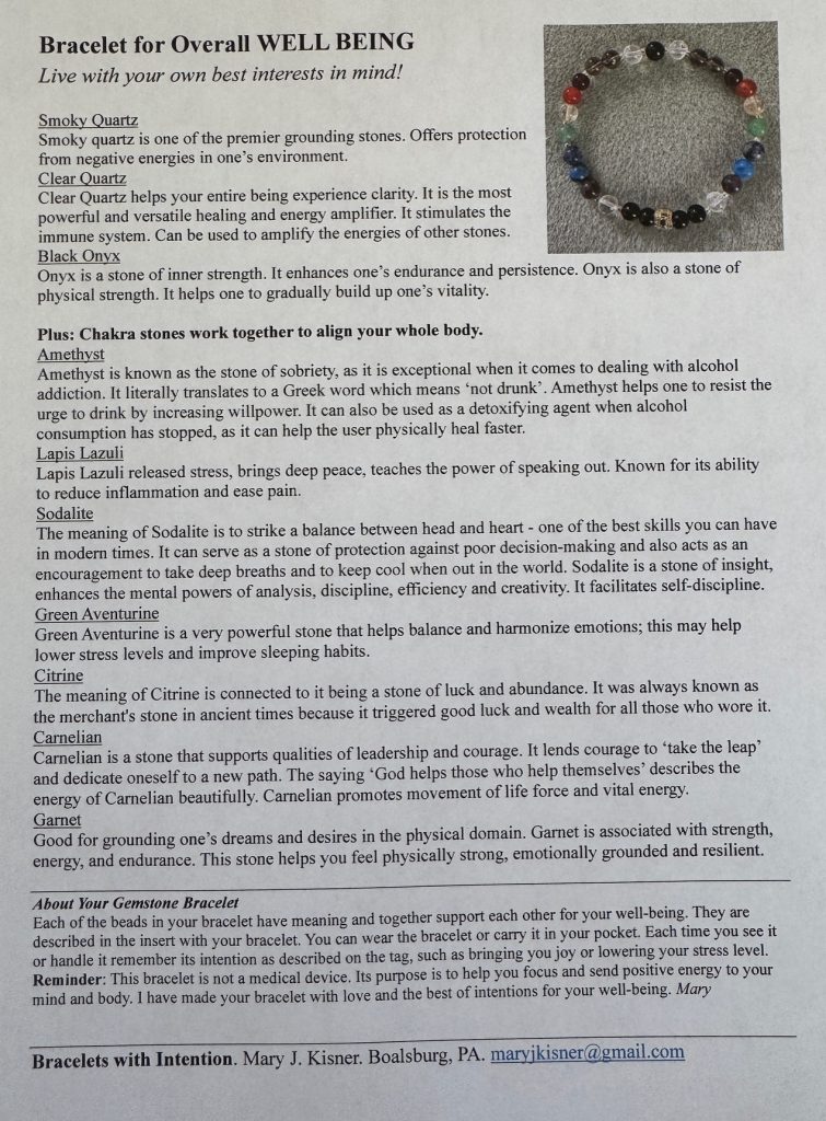 Each of the beads in your bracelet have meaning and together support each other for your well-being. They are described in the insert with your bracelet. You can wear the bracelet or carry it in your pocket. Each time you see it or handle it remember its intention as described on the tag, such as bringing you joy or lowering your stress level. Reminder: This bracelet is not a medical device. Its purpose is to help you focus and send positive energy to your mind and body. I have made your bracelet with love and the best of intentions for your well-being. Mary Kisner
