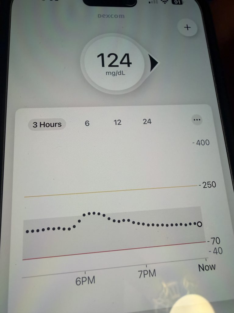 With Bert’s help, the monitor was stuck to my arm and covered with a patch. The device has a little needle in my arm that checks my blood sugar every 5 minutes! No pain! Amazing! Then I started the new meds. It took a day or two for the new meds to get in my system. I could watch how my body reacted to the foods I ate…in real time! What an eye-opening experience! The best part was I didn’t have to prick my fingers 4x/day! Made my fingers very happy. Here is what the read-out looks like on my phone: