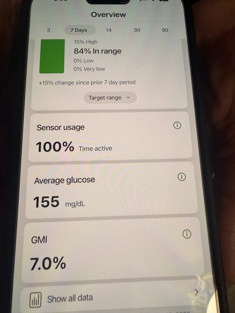 Then, I can switch to another chart and see my average glucose # and the GMI…I think that’s equivalent to the A1c…maybe? Maybe the health professionals in my family can send me info about that (smile). Luckily, the specialist can also read my charts from his office so he knows how things are going.