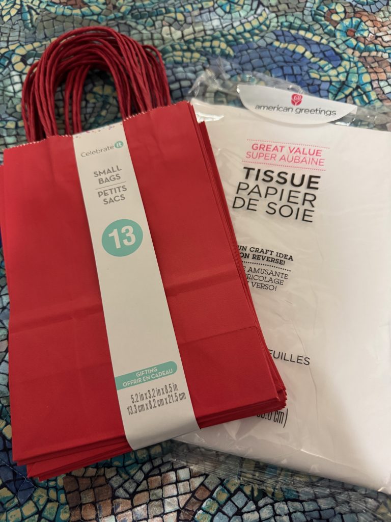 I started with the container…I found small red gift bags at Michaels. I had to go to Walmart to get enough white tissue paper.
