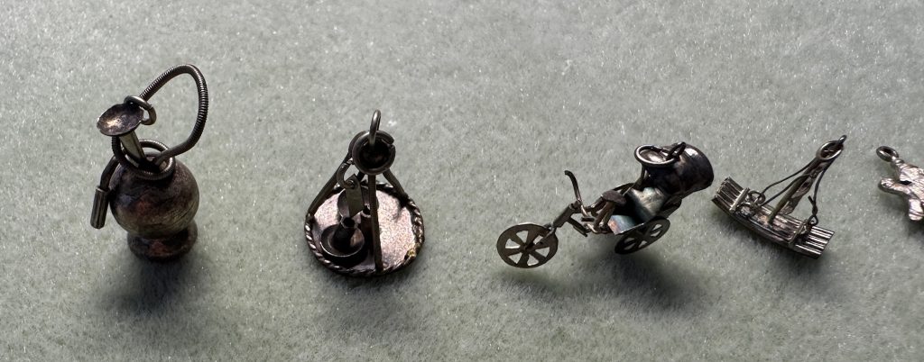 My favorite charm in the whole pile…this very delicate bike with a seat for a passenger! I know I saw those in the Philippines…in 1955-56!