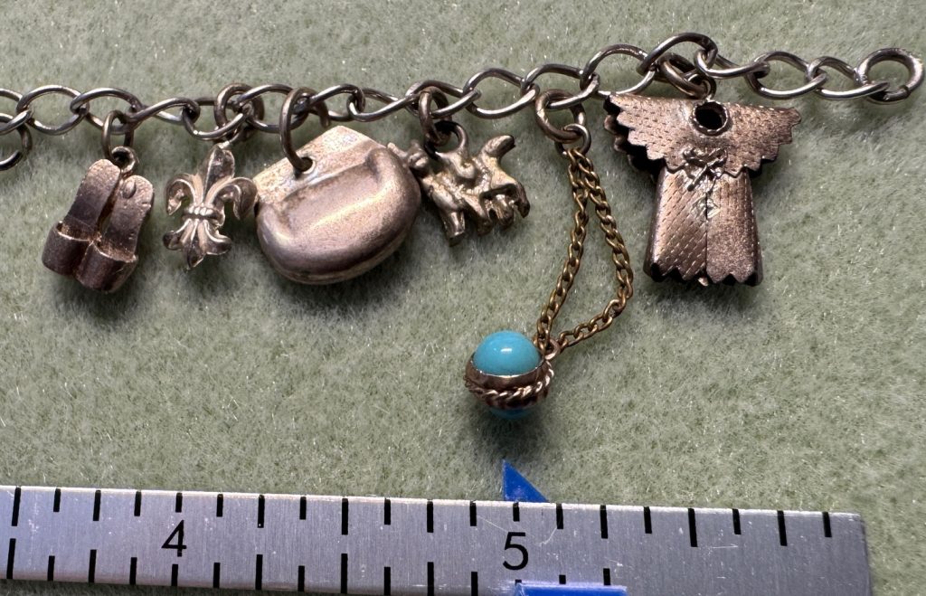 While I was thinking about various charms for that post, I remembered a charm bracelet that had been tucked in with my mother’s jewelry. I hadn’t thought about it in years, and she passed away in 1988. the bracelet and charms fit into a tiny box. I vaguely remember she picked up these charms on one or more of my parent’s overseas trips…one charm in each place/country they visited. She never really told me about them, plus I was home with two toddlers and just couldn’t relate at that time. When she passed, all chance of asking about them was gone. Of course, my dad lived another 22 years, but of course that little box was tucked away…out of sight, out of mind! The lesson here is…if you have an assortment of charms in your jewelry box that have a memory attached, consider writing down what they mean to you…otherwise, you’ll be passing on a mystery to someone else!