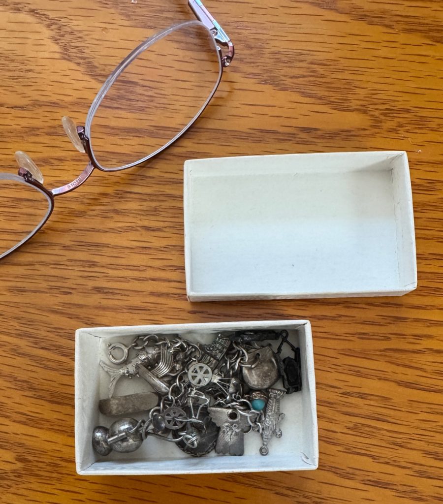 I carefully emptied the box to take pictures of the charms. I know most of their travels were to and from Southeast Asia, but I’m sure they had stops along the way. These charms were silver (or tin?) and many were quite delicate. I don’t know if they were arranged in any specific order or if she had a favorite.