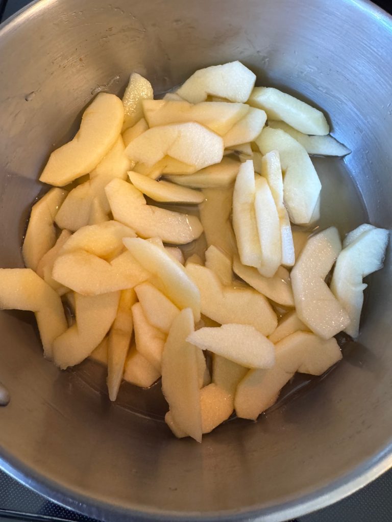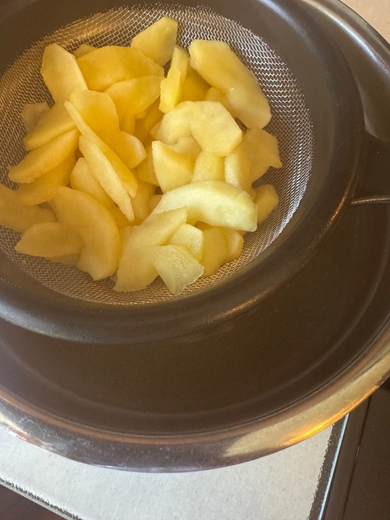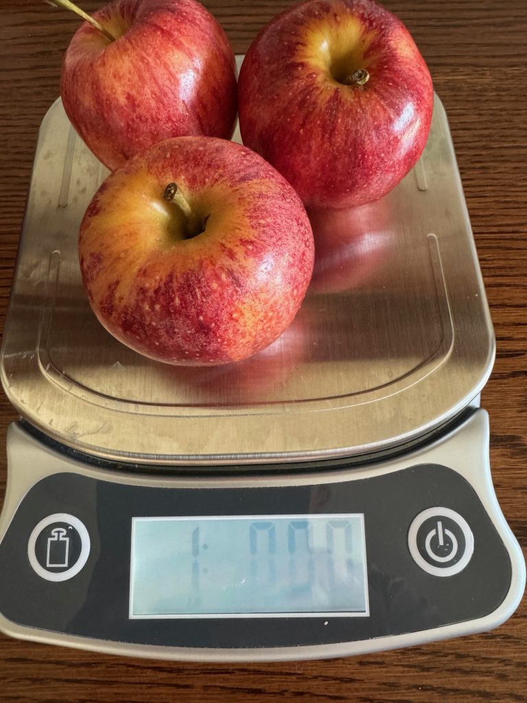 - Peel and slice the apples (I used three apples and weighed them to be sure).