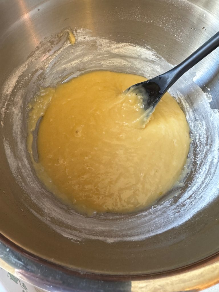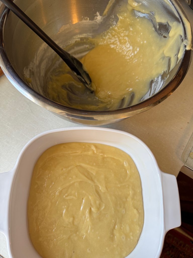 6. Transfer about 3/4 of the batter into the prepared pan or casserole. Smooth the top.
