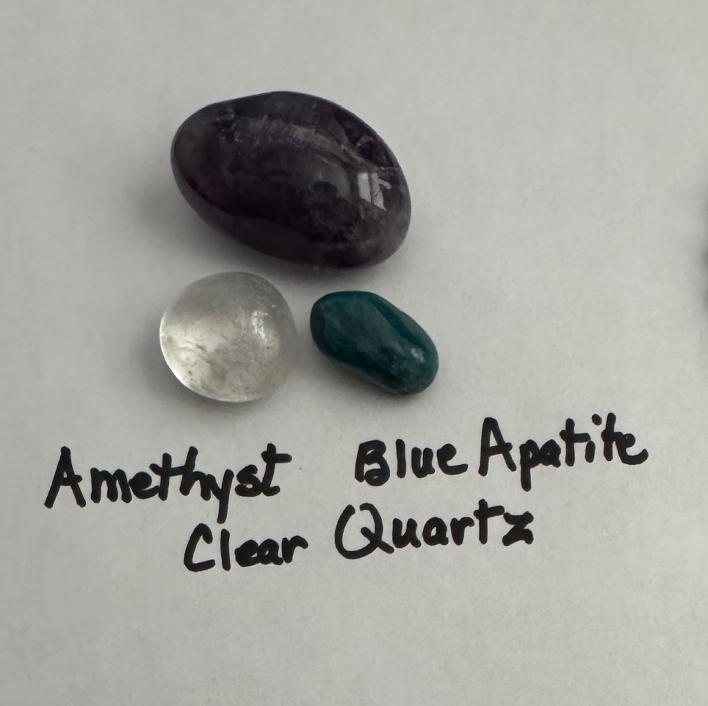 I think it all started with an advertisement from Sedona Crystal Vortex, a rock shop in Sedona (https://sedonacrystalvortex.com/). We had visited Sedona several years before and enjoyed the shops near our hotel. I seemed to be on their mailing list! One of the ads showed a little bag of stones that could be kept in my pocket. It said if I carried them in my pocket and handled them frequently throughout the day, they would help me lose weight. Riiiight! I was intrigued so I ordered them. There were 5 little stone chips in a tiny mesh bag tied tight. I started learning about those particular stones and carried them in my pocket for quite a while. Nothing magic, but every time I put my hand in my pocket, I noticed them and remembered the reason they were there. This ‘intention’ kept my focus on why I should pay attention to what I was eating. The picture below shows three of those stones that are now in my collection. I’m not sure what the other stones were, but it doesn’t matter. Three seemed to be the number of items I could focus on.