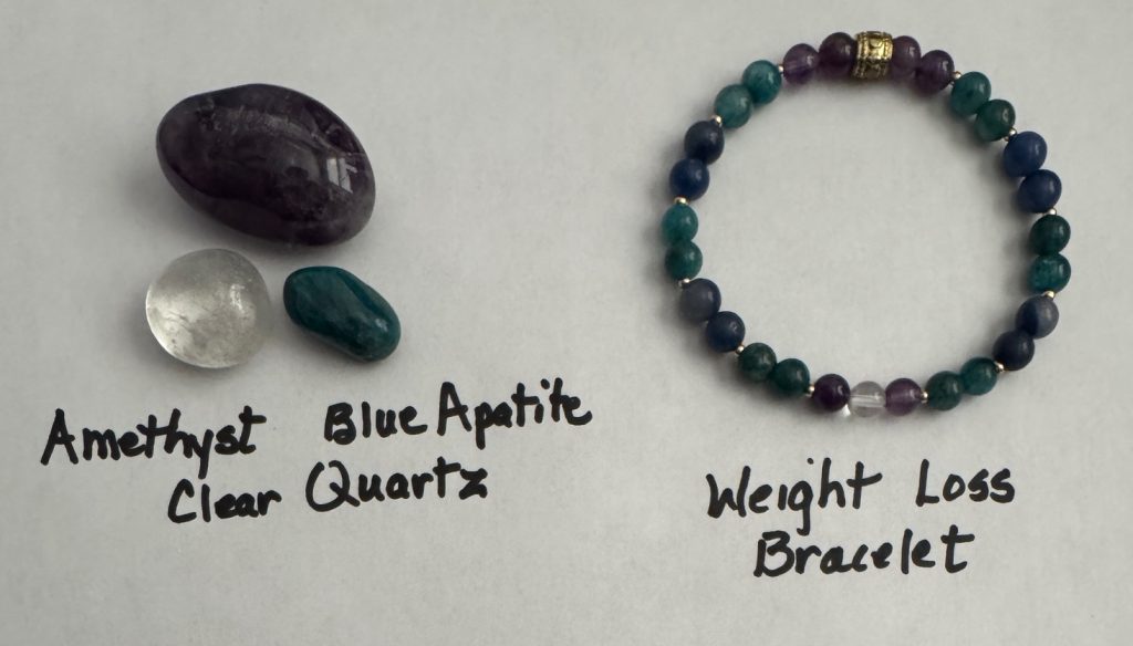 At this point, my interest in the stone beads led me to make bracelets that would address a specific issue…like joy or courage. The first bracelet was my weight loss bracelet, using the same stone beads as the stones I carried in my pocket!