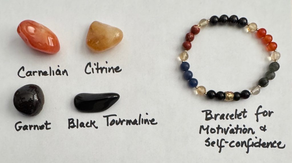One of the most recent bracelets I’ve made had quite a few different beads, all to support motivation, energy, self-confidence and self-discipline. I made it just for me for days when I needed a kick to get me moving! It turns out several other people were interested in it also.
