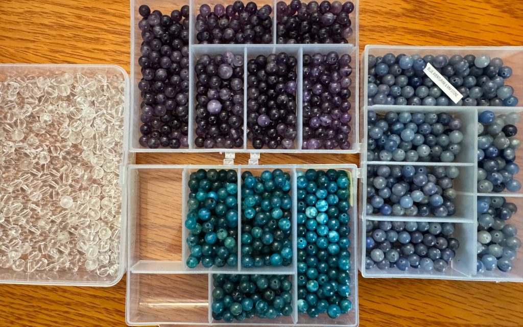 On Etsy, I discovered a seller that made bracelets with 4mm beads, all the same stone… I ended up buying quite a few. It was a much easier way to take the beads with me, rather than a pocket of stones! However, many of the stones I wanted weren’t available as bracelets and the bracelets didn’t fit well, so they stayed in the drawers!