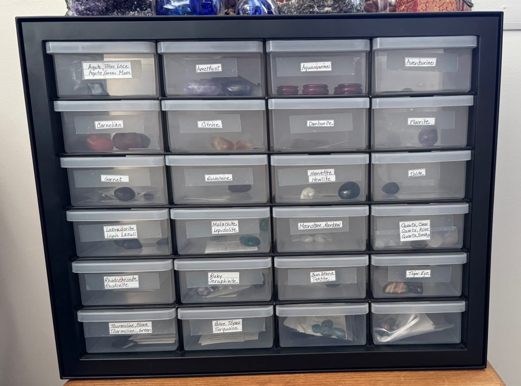 Over the next few months, I built the beginning of my stone collection. They were pretty and I enjoyed reading about their histories and how they were used in the past. I was so afraid I would mix them up I tried to make sure I labeled each one and put them into little drawers with the information cards about each stone.